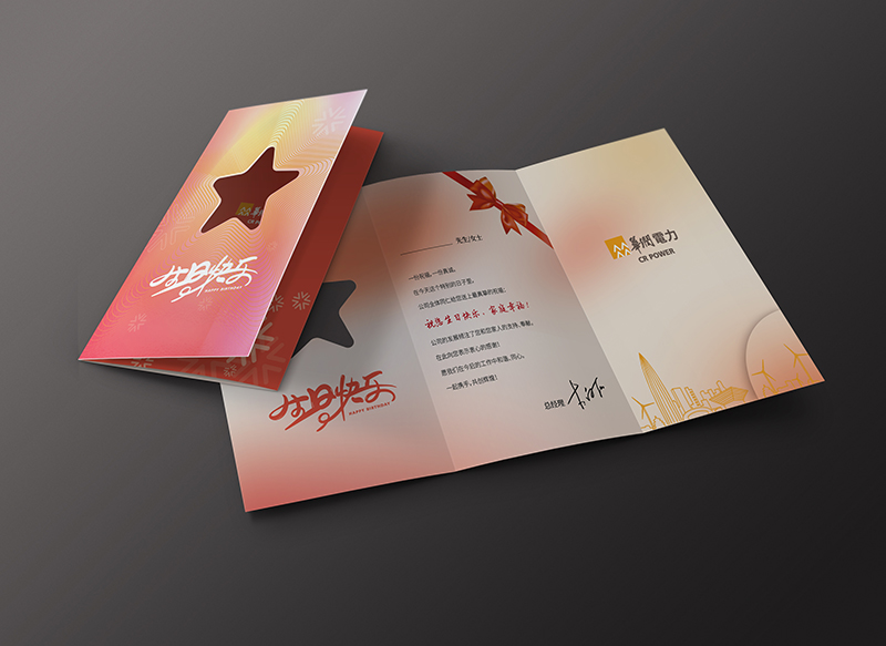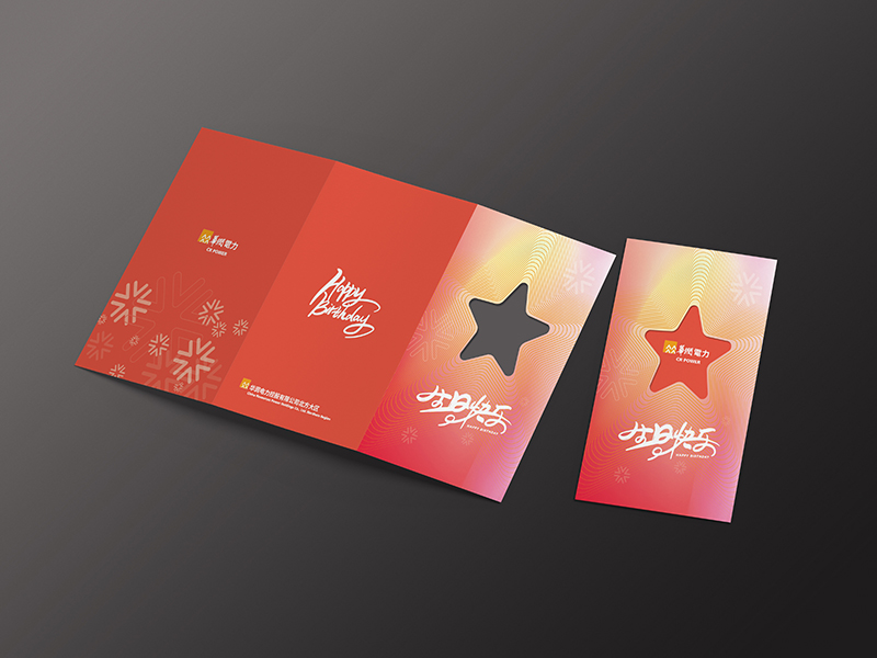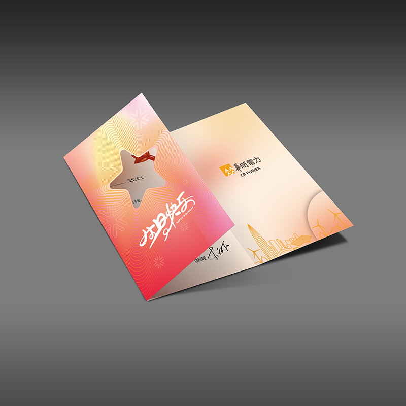 運用華潤官方輔助圖形進行封面設計,封面采用鏤空工藝,將輔助圖形進行結合與變換,整體顏色由淡黃、淡粉到橘紅的漸變設計,雖然沒有紅色那么亮眼突兀,但卻營造了溫馨的氛圍,符合客戶對于賀卡功能上的要求。折頁內(nèi)部還加了卡槽,方便公司發(fā)放員工福利。